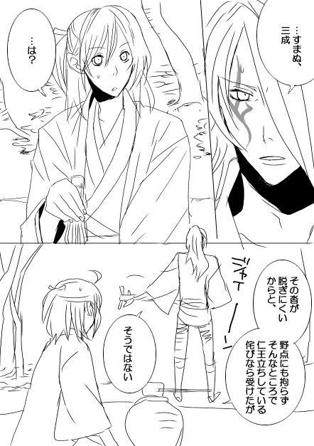 そういえば身分とかだとどっちが上なんでしょ、今さらだけど。両家とも大名だけど、三成は従四位下、幸村は従五位下相当か。じゃ三成の方が(朝廷から見れば)上なのですかね。石高でも石田のほうが高いですけど家格が古いのは真田? いやでも石田家は源平のころから続いてるのか。